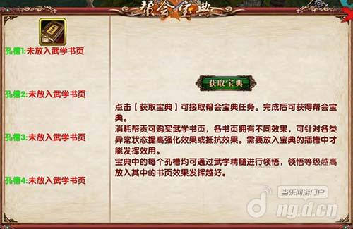 宝典收集 更换镶嵌灵活掌控 宝典是帮会装备系统中的另一项重要内容,它的主要作用是为玩家附加BUFF效果。而BUFF种类、作用则可以通过更换书页、镶嵌武学精髓等操作灵活控制,使玩家在战斗中时刻保持有利形势,胜利机率大大提高,战斗过程也会变得更加有趣。武学精髓可以通过守卫圣坛活动获得,而书页则可以使用帮派贡献兑换。