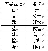 我们可以通过装备精炼来提高装备的品质,将装备品质从绿色提高到蓝色、从蓝色提高到紫色、从紫色提高到橙色。现在附上一张装备品质和名称的对照表: