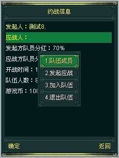 友友们在应战之后,还要设定一些相关内容,包括获胜后的奖金分配和队伍的口令。一旦设置完成后,在点击应战的按钮之后,系统就会提示“应战约战成功”。