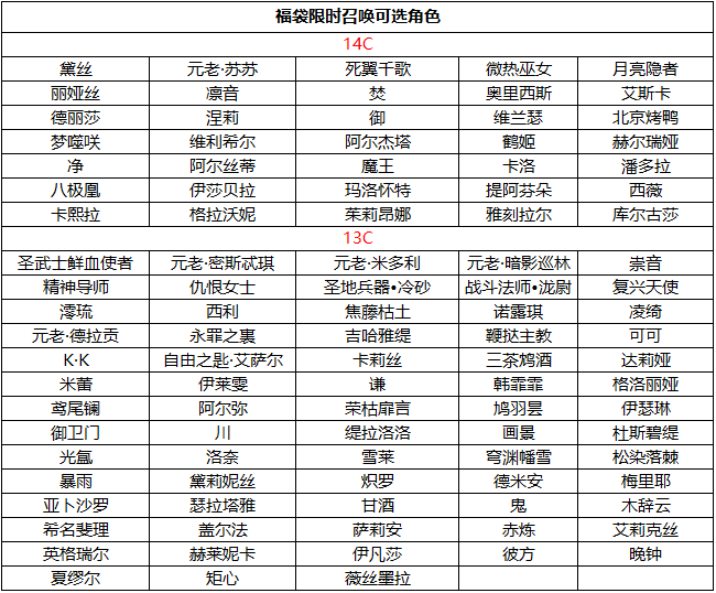 2、玩家须先自选12名角色(14cost 4名,13cost 8名),之后可以消耗福袋召唤券进行召唤,必定获得所选取的12名角色其中的一名角色;
