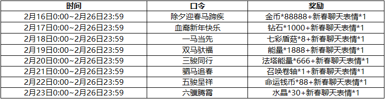 1、2月10日05:00:00~2月24日04:59:59,每日限时任务开启,完成指定任务可获得“奔马令牌”和丰厚材料奖励;2月16日05:00~2月17日04:59登录即可在任务中领取钻石*666;2月17日05:00~2月18日04:59登录即可在任务中领取体力*666;