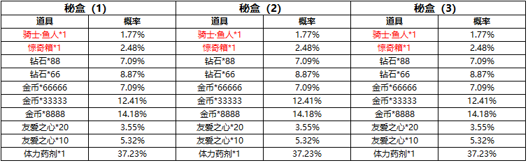 注:惊奇箱开启后可获得角色:神眷·鱼人*1 or 神力·鱼人*1 or 元老·鱼人*1 or 钻石*100